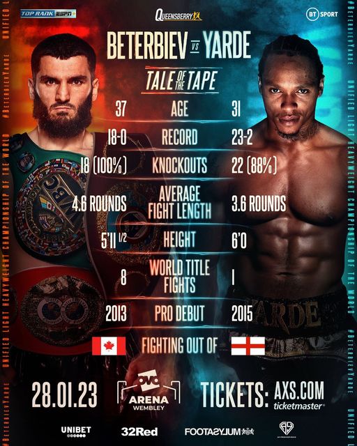 - Artur Beterbiev v Anthony Yarde – Scheduled for January 28 for the undefeated Russian, Beterbiev’s light-heavyweight world titles. Both are renowned big punchers and Londoner Yarde is making his second attempt at winning a world title. Fireworks are expected either way.