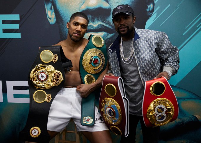 Champ Anthony Joshua poses with Floyd Mayweather post-fight Saturday. Photo: Matchroom Boxing