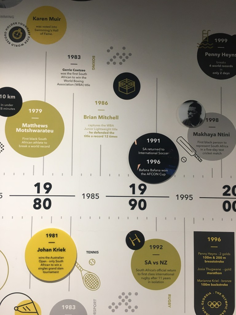 This heritage and diversity of South African sports is represented in the Hall by a timeline display showing key moments of their sporting success.