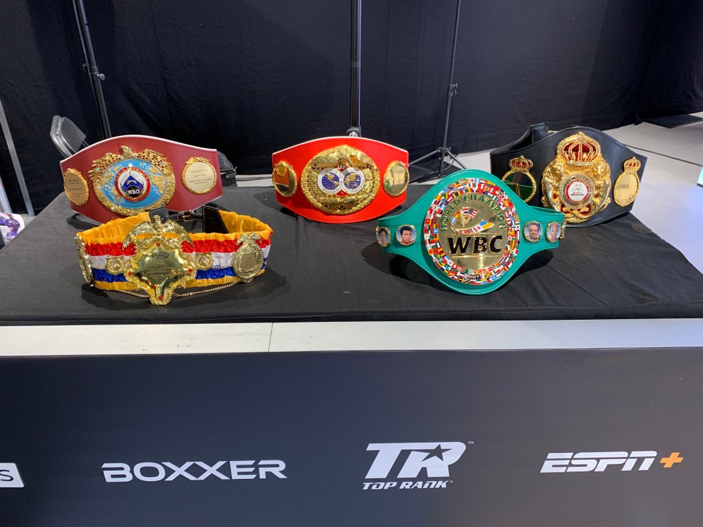 Boxing’s world belts – The Ring championship bottom left.